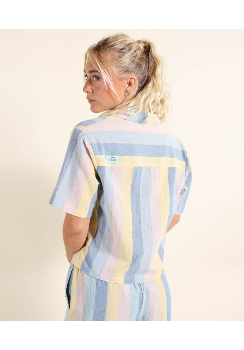 Camisa de cambray de algodón de manga corta con rayas teñidas en hilo y acabado desteñido, corte cropped.